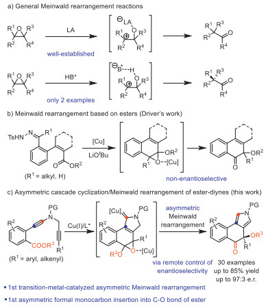 • The Meinwald rearrangement (MR) refers to the process of conversion of epoxides to carbonyl compounds via the 1, 2-migration of one of the substituents of the epoxide ring, and has been widely used in the synthesis of biologically active molecules [1-14]. Although significant achievements have been made in the past decade [15-26], these protocols mostly rely on the use of epoxides directly as precursors, which may limit the practical application of this approach because the stability of epoxides is generally poor, and strong oxidants are typically needed during the preparation process of epoxides. Moreover, examples of catalytic asymmetric MRs, which are able to transform racemic epoxides into enantioenriched α-substituted ketones, are still quite scarce and limited to chiral Brønsted acid (BA) catalysis (Scheme 1a) [27-32]. For example, Zhu and co-workers in 2019 demonstrated an elegant protocol for chiral phosphoramide-catalyzed enantioselective MR of tetrasubstituted epoxides, leading to the formation of chiral 2, 2-diarylcyclohexanones [27]. Simultaneously, Sun and co-workers achieved the asymmetric MR of tetrasubstituted epoxides by chiral phosphoric acid (CPA) catalysis for the synthesis of both cyclic and acyclic ketones [28]. In 2015, Driver's group disclosed the in situ generation of tetrasubstituted epoxides by the reaction of copper carbenes with the ester group, followed by copper-catalyzed MR, affording tricyclic 2H-naphthalenones containing an oxa-quaternary carbon center (Scheme 1b) [33]. Thus, this method provides a new strategy for MR by the direct conversion of esters into ketones [34-42] via monocarbon insertion into C–O bond of ester. Despite these achievements, such an ester-based MR and the related protocols [43-46] are extremely rare. Therefore, the exploration of new strategies for MR, especially in a practical and asymmetric approach, is highly desirable.