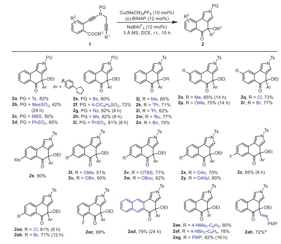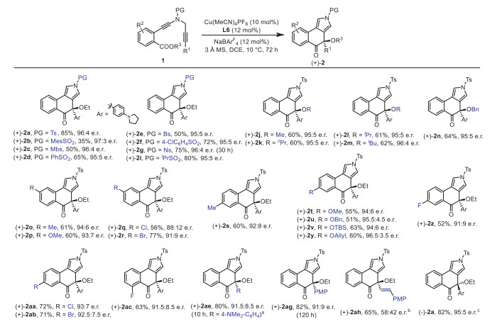 Scheme 3  Reaction scope for the formation of tricyclic pyrroles (+)−2. Reactions run in vials; 1 (0.2 mmol), Cu(MeCN)4PF6 (0.02 mmol), L6 (0.024 mmol), NaBArF4 (0.024 mmol), DCE (4 mL), 3 Å MS (120 mg), 10 ℃, 8–24 h; yields are those for the isolated products; e.r. is determined by HPLC analysis. a At 0 ℃. b CuTc (0.02 mmol), L (0.024 mmol) [79], NaBArF4 (0.024 mmol), DCE (4 mL), H2O (0.4 mmol), 40 ℃, 15 h. c Ent-L6 instead of L6.