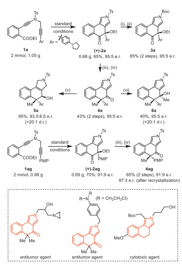 In order to explore the synthetic utility of this method, we then synthesized the chiral tricyclic pyrrole (+)−2a on a preparative-scale and performed a series of transformations, as depicted on the Scheme 4. Pleasingly, the preparative-scale reaction of N-propargyl ynamide 1a also achieved excellent enantioselectivity, albeit with a slight decrease in yield. Subsequently, the Ts group of (+)−2a was readily removed by the treatment with tBuOK, followed by protection with the Boc group, affording the corresponding product 3a (65%, 2 steps, 95:5 e.r.). In addition, (+)−2a could react with MeLi to obtain the corresponding chiral tertiary alcohol, which underwent further pinacol rearrangement under acidic conditions (see Supporting information for details), leading to the pyrrole-conjugated ketone 4a (43%, 2 steps, 95:5 e.r.) bearing an all-carbon quaternary stereocenter. This tricyclic ketone 4a could be further converted into the desired reduction product 5a (95%, > 20:1 dr., 93.5:6.5 e.r.) and new tertiary alcohol 6a (40%, > 20:1 dr., 95:5 e.r.) by treatment with NaBH3CN and MeLi, respectively. Preparative-scale reaction of diyne 1ag was also feasible to produce the expected (+)−2ag (70%, 91:9 e.r.), which underwent similar methylation and pinacol rearrangement, delivering the corresponding product 4ag (65%, 2 steps, 91:9 e.r.). After recrystallization of 4ag, we determined its absolute configuration by X-ray diffraction (Fig. 2), which also determined the absolute configuration of chiral tricyclic pyrroles (+)−2 (see Supporting information for details). Importantly, the enantioselectivity was well maintained and excellent diastereoselectivities were achieved in all these transformations. It is notable that these tricyclic pyrrole skeletons can be found in a variety of bioactive molecules with antitumor and cytotoxic activity [83-91] and may be of medicinal interest.