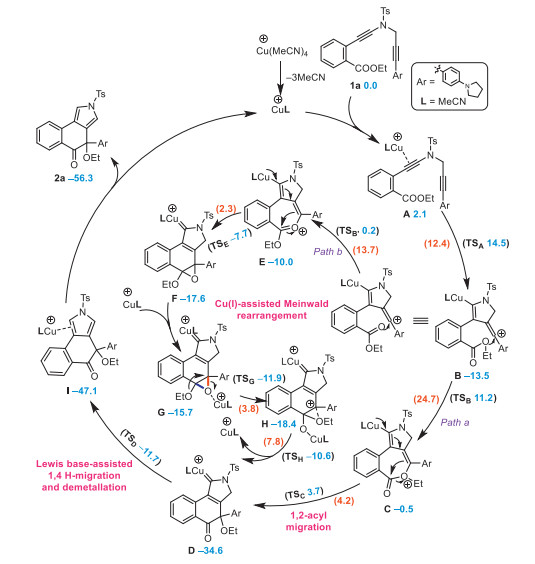 Based on the above experimental results, density functional theory (DFT) computations have been performed to gain more insights into the mechanism for the synthesis of product 2a from 1a and elucidate the origin of enantioselectivity. As is exhibited in Scheme 5, at the beginning of the reaction the coordination of CuL (L = MeCN) copper species to diyne 1a leads to a [Cu]-tethered intermediate A, which subsequently triggers an intramolecular cyclization to afford the vinyl cation intermediate B via a transition state TS. After the formation of the vinyl cation intermediate B, path a (a nucleophilic addition and a concerted C–O bond cleavage and C–C coupling process) and path b (two consecutive nucleophilic addition and a [Cu]-assisted MR process) have been considered to afford the copper-carbene intermediate D, and path b is thermodynamically more favorable with a largest barrier height of 13.7 kcal/mol compared to 24.7 kcal/mol of path a. Finally, similar to our previously reported studies [50-61], a Lewis base (H2O, for example)-assisted formal [1, 4]-H migration and demetallation process (barrier height: 22.9 kcal/mol) affords the product 2a. It is worth mentioning that different from Driver's protocol [33], involving a [1, 2]-alkyl shift in the MR, the [1, 2]-OEt shift is involved in the present MR as the C–O bond in red is more inclined to be cleaved rather than the C–O bond in blue due to the presence of the electron-rich aryl group (pushing the electron back to facilitate the C–O bond cleavage). Above all, the reaction can proceed smoothly under the given conditions, via the Meinwald rearrangement-involved mechanism depicted as path b, with the [1, 4]-H migration step being the rate-determining step.