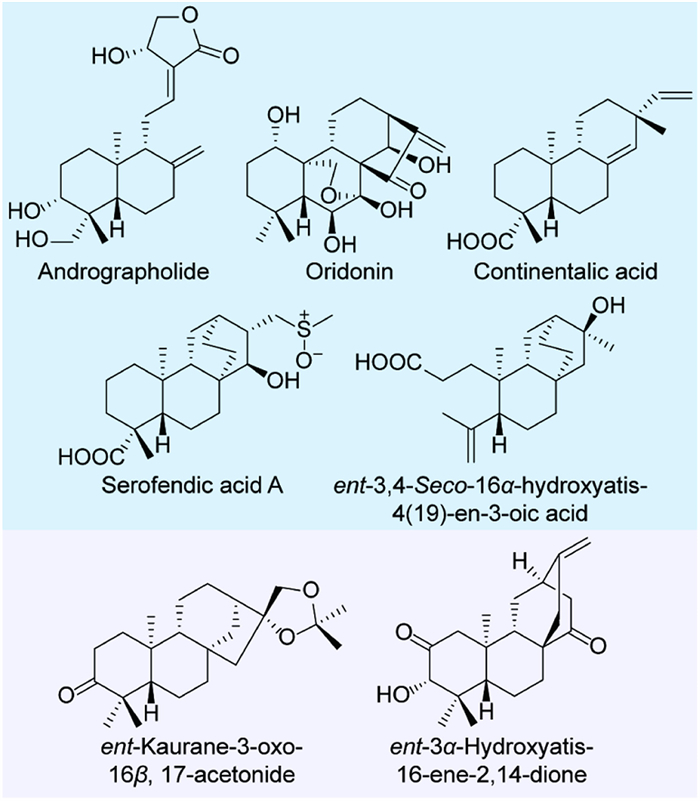 • Labdane-related diterpenoids (LRDs), the largest group of diterpenoids, exhibit a vast structural diversity, including bicyclic structures (e.g., labdane), tricyclic structures (e.g., pimarane and abietane) and tetracyclic structures (e.g., kaurane, atisane, beyerene, and stemodane) [1]. Many LRDs have been used for drug development [2], such as andrographolide (ent–labdane type, an anti-inflammatory drug) [3,4], oridonin (ent–kaurane type, a promising anti-cancer lead) [5], continentalic acid (ent–pimarane type, with a dramatic inhibitory activity against methicillin-resistant Staphylococcus aureus) [6], serofendic acid A (ent–atisane type, a potent neuroprotective agent) [7,8], and ent–3,4-seco-16α-hydroxyatis-4(19)-en-3-oic acid (ent–atisane type, with a significant inhibitory activity against the biofilm adherence of Pseudomonas pseudoalcaligenes) (Fig. 1) [9]. For all these LRDs, oxidative functionalization is required for their bioactivities. In the biosynthesis of plant terpenoids, the olefin precursors are mainly oxidized by cytochrome P450s (CYPs) [10]. Although CYPs involved in the biosynthesis of plant LRDs have been widely characterized, the oxidative functionalization of many sites in the LRDs isolated to date remains unknown. Mining CYPs with novel catalytic properties (e.g., specificity or promiscuity in catalysis and substrate tolerance) can expand the toolkit for bioproduction of diverse LRDs.