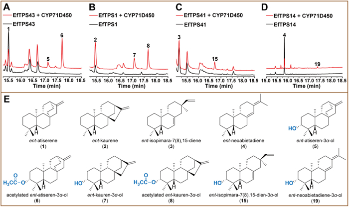 Figure 2.  Functional characterization of CYP71D450. GC–MS detection of the extracts of the yeast strains respectively expressing CYP71D450/EfTPS43 (A) and CYP71D450/EfTPS1 (B). GC–MS detection of the extracts of the E. coli strain expressing CYP71D450/EfTPS41 (C) and N. benthamiana expressing CYP71D450/EfTPS14 (D). (E) The structures of the products.