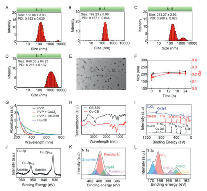 Figure 1.  Preparation and characterization of Cu-CB. The size distribution of different formulations prepared by the feeding ratio of (A) 8:1, (B) 8:3, (C) 8:5, (D) 8:7. (E) The TEM image of Cu-CB. Scale bar: 200 nm. (F) The stability of Cu-CB. (G) UV–vis spectra of various agents. (H) FTIR spectra of CB-839 and Cu-CB. (I) XPS analysis of Cu-CB. XPS spectra of (J) Cu 2p, (K) N 1s and (L) S 2p.