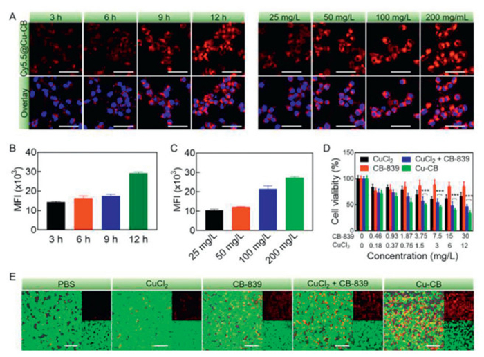 Figure 2.  Antitumor study of Cu-CB in vitro. (A) CLSM images of 4T1 cells to observe the incubation time and drug dose dependent cellular uptake behavior after treatment with Cy5.5@Cu-CB. Scale bar: 50 µm. (B) Fluorescence quantitative analysis of 4T1 cells following treatment with Cu-CB for different time points (n = 3). (C) Fluorescence quantitative analysis of 4T1 cells following treatment with various concentrations of Cu-CB (n = 3). (D) Cell viability of 4T1 cells treated with different concentrations of drugs (n = 5). (E) Live/dead cell staining of 4T1 cells after treatment with PBS, CuCl2, CB-839, CuCl2 + CB-839 or Cu-CB. Scale bar: 200 µm. ***P < 0.001. The numerical results were presented as means ± standard deviation (SD).