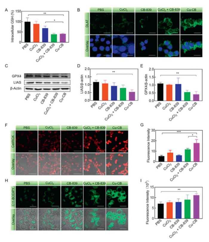 Figure 3.  The antitumor mechanism of Cu-CB. (A) The intracellular GSH content of 4T1 cells after treatment with PBS, CuCl2, CB-839, CuCl2 + CB-839 or Cu-CB (n = 3). (B) DLAT immunofluorescence staining of 4T1 cells after different drug treatments. Scale bar: 20 µm. (C) Western blot analysis of GPX4 and LIAS. Quantitative analysis of the expression of (D) LIAS and (E) GPX4 (n = 3). (F) The ROS production and (G) quantitative fluorescence analysis of 4T1 cells after different drug treatments (n = 3). CellROX was used as the probe. Scale bar: 50 µm. (H) The lipid peroxides production and (I) quantitative fluorescence analysis of 4T1 cells after different drug treatments (n = 3). C11-BODIPY was used as the probe. Scale bar: 20 µm. *P < 0.05, **P < 0.01, ***P < 0.001. The numerical results were presented as means ± SD.