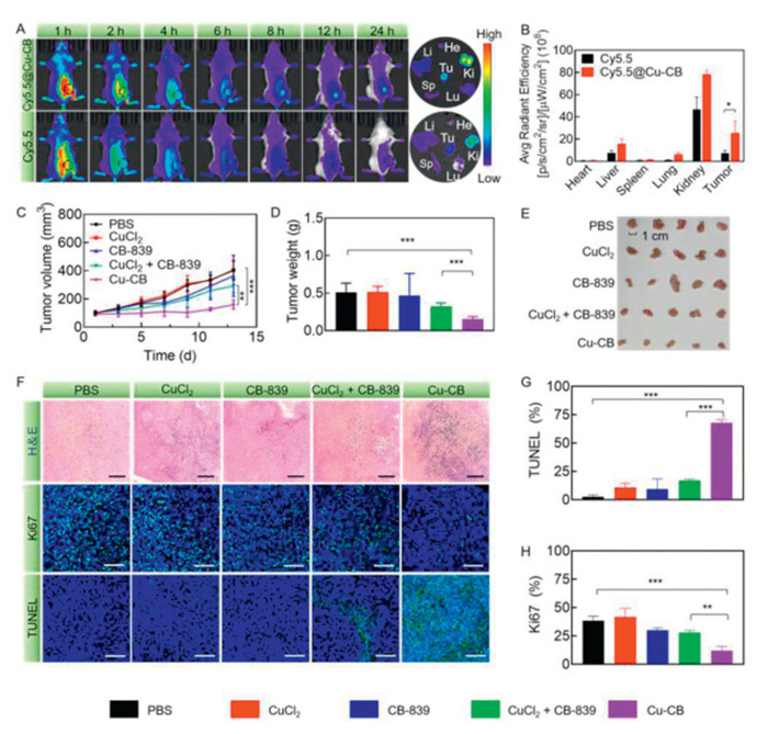 Figure 4.  Antitumor study of Cu-CB in vivo. (A) The biodistribution of Cy5.5@Cu-CB and Cy5.5 in 4T1 tumor-bearing mice. (B) Quantitative fluorescence analysis of Cy5.5 and Cy5.5@Cu-CB in major organs (n = 3). (C) The tumor volumes, (D) weights and (E) image of 4T1 tumor-bearing mice after treatment with PBS, CuCl2, CB-839, CuCl2 + CB-839 or Cu-CB (n = 5). (F) H&E, TUNEL and Ki67 staining of tumor tissues after different drug treatments. Scale bar: 100 µm. The positive rate of (G) TUNEL and (H) Ki67 in tumor tissues. *P < 0.05, **P < 0.01, ***P < 0.001. The numerical results were presented as means ± SD.