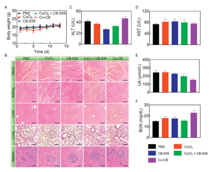 Figure 5.  Biosafety analysis of Cu-CB. (A) The body weights of 4T1 tumor-bearing mice after treatment with PBS, CuCl2, CB-839, CuCl2 + CB-839 or Cu-CB (n = 5). (B) H&E staining of heart, liver, spleen, lung and kidney. Scale bar: 200 µm. (C) ALT, (D) AST, (E) UA and (F) BUN serum levels from biochemical tests of 4T1 tumor-bearing mice after treatment with PBS, CuCl2, CB-839, CuCl2 + CB-839 or Cu-CB (n = 3). The numerical results were presented as means ± SD.
