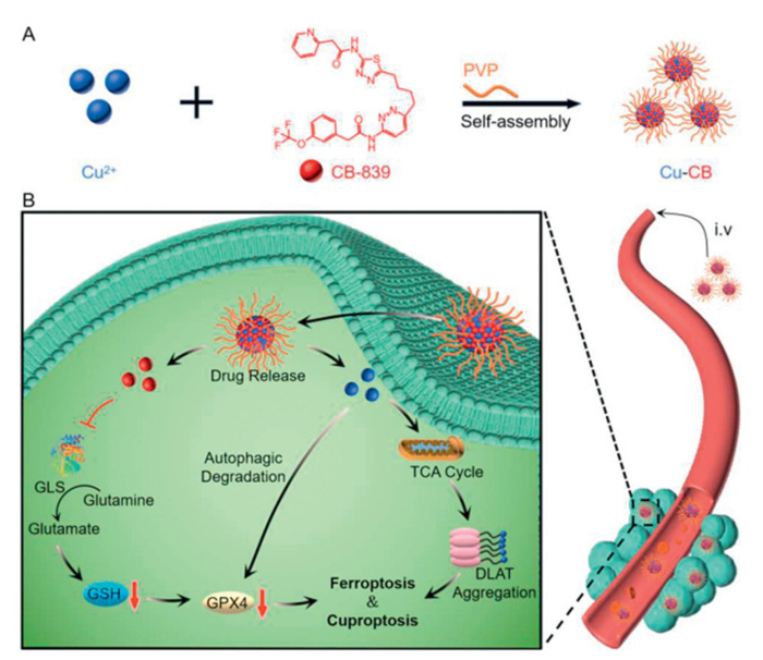Scheme 1.  Schematic illustration of Cu-CB to trigger cuproptosis and cell ferroptosis for synergistic breast cancer suppression. (A) Cu-CB was prepared by the coordination effect between Cu2+ and CB-839 with the assistance of PVP. (B) Proposed mechanism of Cu-CB for tumor eradication. Cu-CB could passively target the tumor tissue after intravenous injection. Upon internalization by breast cancer cells, Cu-CB inhibited GSH synthesis and downregulated GPX4, triggering ferroptosis. Simultaneously, reduced GSH further promoted Cu2+ to induce DLAT aggregation and proteotoxic stress, initiating cuproptosis. This dual mechanism enabled Cu-CB to effectively induce both cuproptosis and ferroptosis, achieving synergistic therapy of breast cancer.