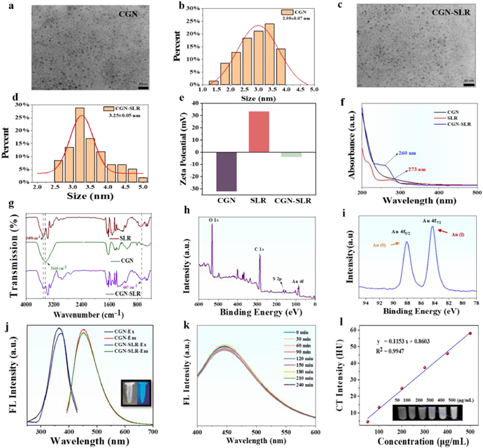 Figure 1  Characterization of CGN-SLR nano-system and the dual-mode imaging performance of CGN-SLR. (a) TEM image of CGN. (b) Particle size distribution of CGN. (c) TEM image of CGN-SLR. Scale bar: 20 nm. (d) Particle size distribution of CGN-SLR. (e) Zeta potential measurement. (f) Ultraviolet absorption spectrum of CGN-SLR and CGN. (g) FTIR confirms the successful conjugation between CGN and SLR. (h, i) XPS reveals the composition and valence structure of CGN-SLR. (j) Emission spectra of both CGN and CGN-SLR were obtained when excited at 410 nm. Inset: Photographic images of a CGN-SLR solution illuminated with a 410 nm wavelength. (k) Fluorescence intensity of CGN-SLR exposed under UV light for various periods. (l) The CT intensity variation of CGN-SLR was measured at different concentrations (50, 100, 200, 300, 400, and 500 µg/mL). Inset: CT images captured at varying mass concentrations of CGN-SLR.