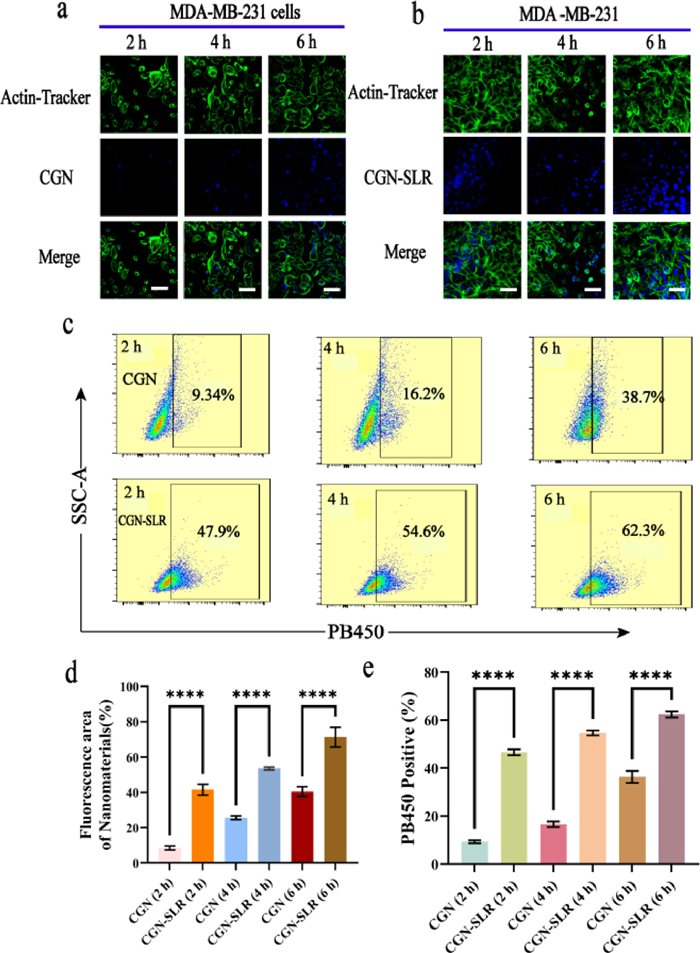 Figure 2.  Targeting specificity assays of CGN and CGN-SLR in MDA-MB-231 cells. (a) MDA-MB-231 cells were treated with CGN at 2, 4, and 6 h. (b) MDA-MB-231 cells were treated with CGN-SLR over the same periods. Scale bar: 50 µm. (c) Flow cytometry analysis (PB 450 channel) of the percentage of fluorescent-positive MDA-MB-231 cells after treatment with CGN and CGN-SLR for 2, 4, and 6 h. (d) Quantitative analysis of blue fluorescence areas in (a) using Image J software. (e) Statistical analysis of flow cytometry data from (c) using GraphPad Prism (9.5.1). Data are presented as mean ± standard deviation (SD) (n = 3). ****P < 0.0001.