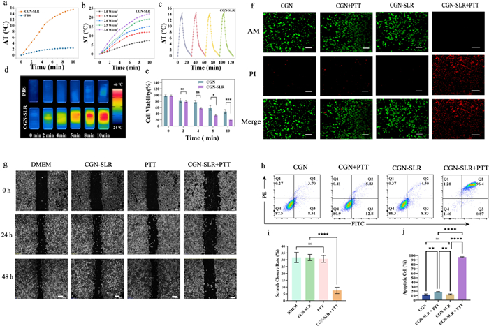 Figure 3  Photothermal performance of the CGN-SLR nanosystem and in vitro evaluation of targeted PTT effects. (a) Temperature changes in CGN-SLR and PBS upon 808 nm laser irradiation at 2.0 W/cm2 for 10 min. (b) Temperature changes in CGN-SLR under varying laser power densities (1, 1.5, 2.0, 2.5, and 3.0 W/cm2) for 10 min. (c) Thermal cycling performance of CGN-SLR. (d) Infrared thermal images of PBS and CGN-SLR exposed to an 808 nm NIR laser at 2.0 W/cm2 for 10 min. (e) CCK-8 assay result of CGN and CGN-SLR upon 808 nm laser irradiation (2.0 W/cm2) for different durations (0, 2, 4, 8, and 10 min). (f) Co-staining of MDA-MB-231 cells with calcein-AM (live cells, green) and propidium iodide (dead cells, red) after different treatments. (g) Assessment of MDA-MB-231 cell migration 48 h post-treatment. Scale bar: 100 µm. (h) Visualization of apoptosis in MDA-MB-231 cells under control, CGN-SLR, single PTT, and CGN-SLR + PTT conditions. (i) Statistical analysis of migration data is depicted in (g). (j) Statistical analysis of apoptosis data is shown in (h). Data presented as mean ± SD (n = 3). P < 0.05, ***P < 0.001, ****P < 0.0001.