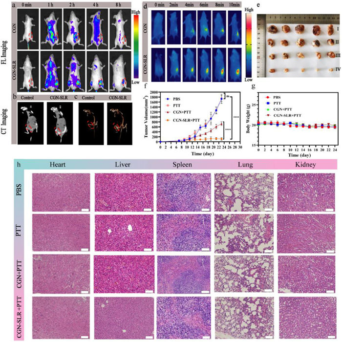 Figure 4.  In vivo targeting fluorescence/CT imaging and assessment of targeted PTT efficacy and safety. (a) The tumor sites and fluorescence signals detected after intravenous injection of CGN and CGN-SLR with an animal fluorescence imaging system. (b) CT imaging of the tumor-bearing mouse before and 4 h after injection of CGN-SLR. (c) Three-dimensional CT imaging corresponding to the same mouse as shown in (b). (d) Thermal imaging of tumor-bearing mice following administration of CGN and CGN-SLR. (e) Post-experiment photographs of mice from each treatment group. Ⅰ, Ⅱ, Ⅲ, and Ⅳ represent the PBS, PTT, CGN+PTT, and CGN-SLR+PTT groups, respectively. (f) Tumor volume changes were monitored after treatments were administered every two days for two weeks across different treatment groups. ****P < 0.0001. (g) Body weight changes of mice in each group over the treatment period. (h) Histological examination (HE staining) of major organs at the end of the experiment. Scale bar: 50 µm. Data are presented as mean ± SD (n = 5).