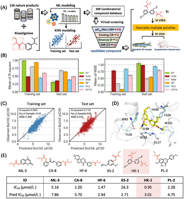 Figure 1.  Schematic illustration of de novo design and development of hBuChE inhibitors for ameliorating AD. (A) Entire workflow for developing efficacious hBuChE inhibitors. (B) The performance of the 5 ML models and the DFNN model on the training and test dataset. Default parameters were used for the ML models if not specified. Data are presented as mean ± standard deviation (SD) (n = 100). (C) Observed vs. predicted pIC50 of the 1416 training and 945 test samples. pIC50 is −log10(IC50). (D) The optimal binding mode of HK-1. (E) Schematic diagram and the bioassay results of 6 representative compounds.