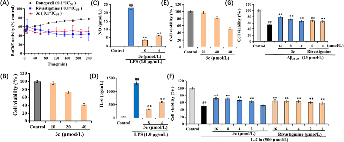 Figure 3  (A) The recovery of BuChE inhibitors (donepezil, rivastigmine and 3c) inhibition after dilution with time monitoring. (B) The cell viability of compound 3c on BV-2 cells was assessed using the CCK-8 assay. (C) Effects of compound 3c on NO release in LPS-stimulated BV-2 cells. (D) Effects of compound 3c on IL-6 production in LPS-stimulated BV-2 cells. (E) Cell viability (%) of compound 3c in HT22 cells. (F) Neuroprotective effects of compounds 3c and rivastigmine on Glu-induced injury in HT22 cells. (G) Neuroprotective effects of compounds 3c and rivastigmine on Aβ25–35-induced injury in HT22 cells. Data are presented as mean ± SD from three independent experiments. ##P < 0.01 vs. control group; **P < 0.01 vs. Glu/Aβ25–35-induced group.