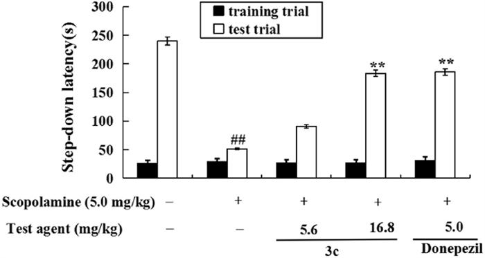 Figure 5  Effects of 3c (5.6 and 16.8 mg/kg) and donepezil (5.0 mg/kg) on scopolamine-induced memory impairment were assessed using the step-down passive avoidance assay. Data are presented as mean ± SD (n = 10). ##P < 0.01 vs. the control group; **P < 0.01 vs. the model group.