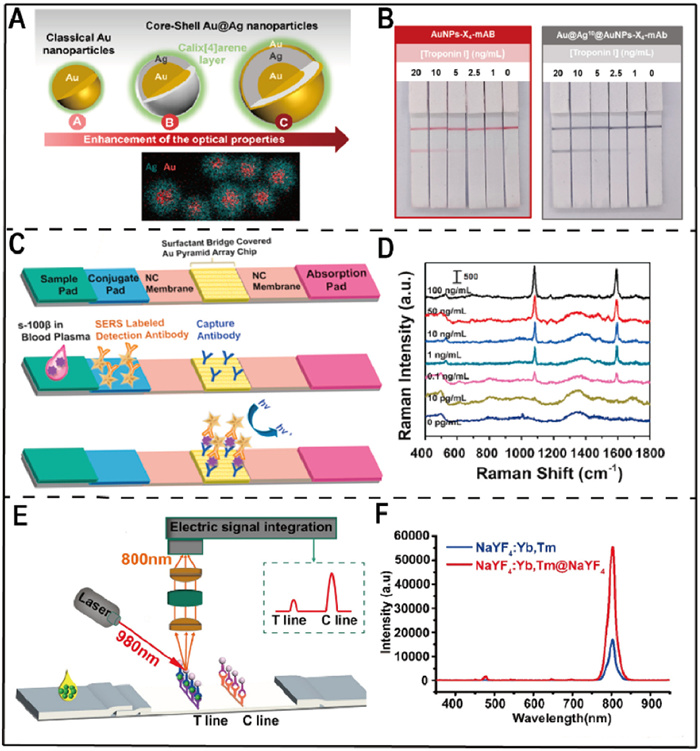 Figure 1.  (A) Au@Ag core-shell nanoparticles were synthesized using the seeded growth mediated method with AuNPs as cores. (B) Schematic diagram of AuNPs-X. Copied with permission [66]. Copyright 2024, American Chemical Society. (C) Schematic of the plasmonic nanostructures “hot spots” LFIA. (D) Signal readout of the SERS. Copied with permission [16]. Copyright 2021, Elsevier. (E) Schematic of UCNPs LFIA. (F) Luminescence spectra of inner core and core/shell UCNPs. Copied with permission [59]. Copyright 2020, American Chemical Society.