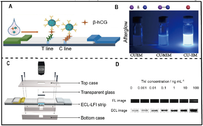 Figure 2.  (A) Schematic diagram of AG flowmetry lamination. (B) Photochemical system for the strategy to improve the quantum yield of AG and the chemical structures of CU, EM, CU-EM, and CUEM. Copied with permission [82]. Copyright 2022, John Wiley and Sons. (C) Schematic of the overall structure of ECL-LFI. (D) Configuration for ECL and FL measurement. Copied with permission [87]. Copyright 2020, John Wiley and Sons.