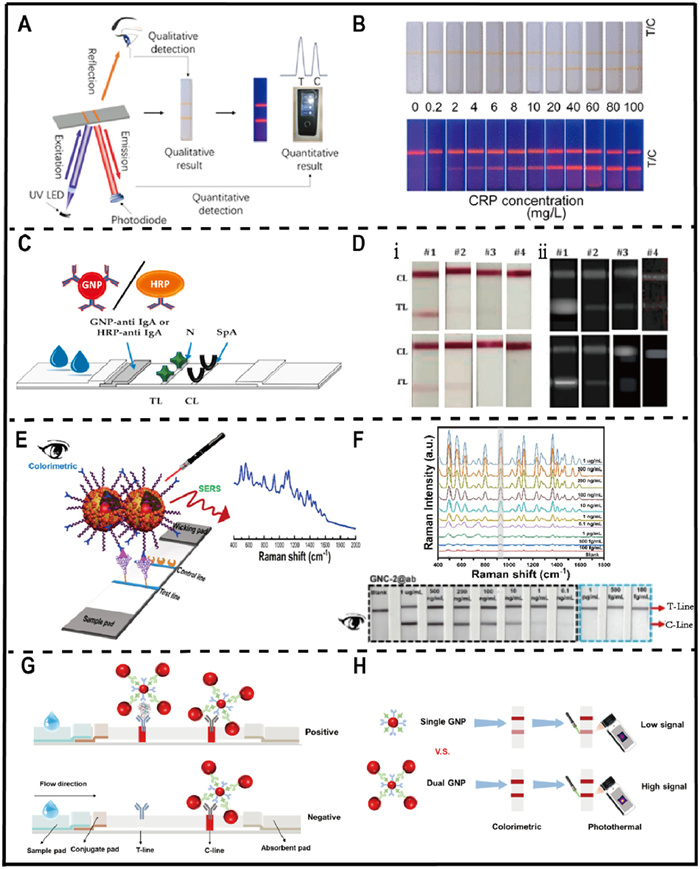 Figure 3  (A) Detection principles and typical results of COL and FL dual-modal LFIA. (B) Images of AIENB-based LFIA strips testing CRP. Copied with permission [40]. Copyright 2024, American Chemical Society. (C) The LFIA strip detector utilizes serum or saliva samples. (D) IgA-Anti-SARS-CoV-2 detection in saliva by (ⅰ) the COL and (ⅱ) CL. Copied with permission [84]. Copyright 2021, Elsevier. (E) Schematic of the synthesis of GNC and images of the COL and SERS-based LFIA. (F) Schematic diagram of COL-SERS. Copied with permission [44]. Copyright 2024, American Chemical Society. (G) Schematic of the structure and detection principle of LFIA. (H) Test results of visible light and infrared thermal images. Copied with permission [88]. Copyright 2024, American Chemical Society.