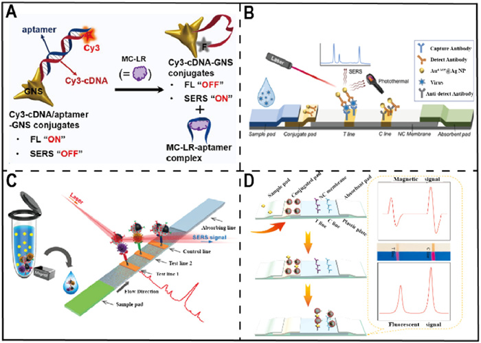 Figure 4.  (A) Schematic of the FL-SERS bimodal aptamer used to detect MC-LR. Copied with permission [99]. Copyright 2020, American Chemical Society. (B) Schematic of the detection of viral antigens and their two detection signals using a portable Raman spectrometer and a thermal imaging camera, respectively. Copied with permission [39]. Copyright 2023, Elsevier. (C) Schematic diagram of the MAG SERS strip for detecting two respiratory viruses. Copied with permission [90]. Copyright 2019, American Chemical Society. (D) Analytical performance graph of LFIA with signal hyphenated: MAG and FL signals. Copied with permission [46]. Copyright 2022, Elsevier.