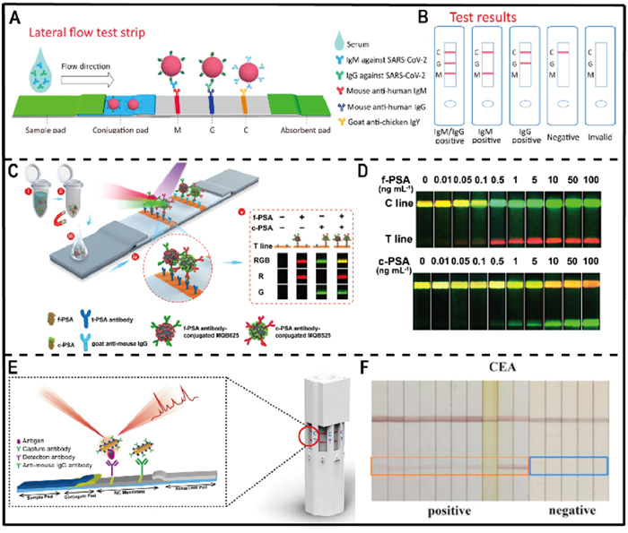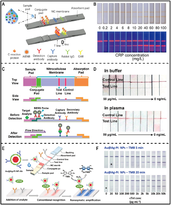 Figure 5  (A) Schematic illustration of the NIR-Emissive AIE Nanoparticle-Labeled LFIA. (B) LFIA optical detection image. Schematic of biomarkers for detection of Acute myocardial infarction (AMI). Copied with permission [31]. Copyright 2021, American Chemical Society. (C) Schematic of biomarkers for detection of PSA. (D) LFIA optical detection of f-PSA, c-PSA images. Copied with permission [128]. Copyright 2021, Elsevier. (E) Schematic of the biomarker column tower for detection of CEA and (F) image of LFA optical detection of CEA. Copied with permission [115]. Copyright 2020, Elsevier.