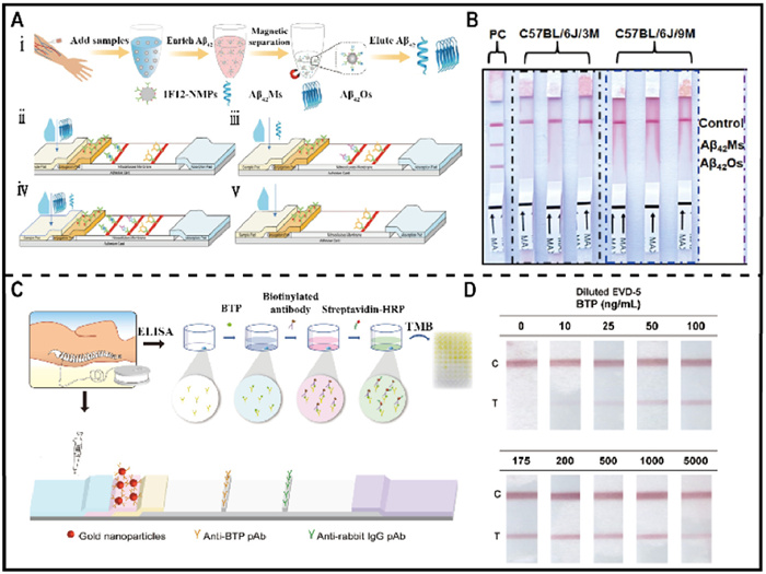 Figure 7  (A) Blood samples were enriched using mAb 1F12-modified MNPs and eluted for LFIA analysis. (B) Visual detection of Aβ42Ms and/or Aβ42Os in human blood samples by LFIA. Copied with permission [107]. Copyright 2021, BioMed Central. (C) Schematic of ELISA for BTP and sample dilution process of the BTP LFIA strip for rapid CSF leakage diagnosis. (D) T-line signal intensity as BTP concentration increases. Copied with permission [133]. Copyright 2022, Elsevier.
