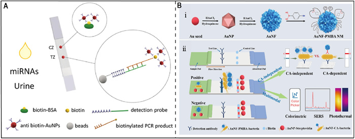 Figure 8  (A) The proposed LFA was developed for the detection of miRNA in urine. Copied with permission [142]. Copyright 2023, Elsevier. (B) Schematic illustrations of the MCI-LFIA biosensor using AuNF-PMBA NMs for bacterial UTI diagnosis: (ⅰ) Preparation of AuNF-PMBA NMs. (ⅱ) Principle of MCI-LFIA for bacterial detection Copied with permission [91]. Copyright 2023, Elsevier.