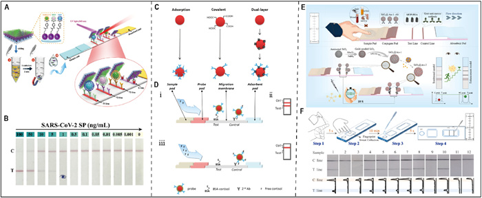 Figure 9  (A) LFIA biosensor for multiplex and ultrasensitive monitoring of EBOV, MPXV, and SARS-CoV-2 antigens. (B) Detection of SARS-CoV-2 SP at concentrations. Copied with permission [20]. Copyright 2024, American Chemical Society. (C) Antibody coupling to gold nanoparticles. (D) The probe encounters salivary cortisol “F” and binds to it. Copied with permission [148]. Copyright 2019, American Chemical Society. (E) Schematic of the stepwise-Au-decoration assisted dual-signal amplified LFIA. (F) Schematic diagram of the LFIA test procedure and results for fingerprint sweat samples. Copied with permission [21]. Copyright 2023, Elsevier.