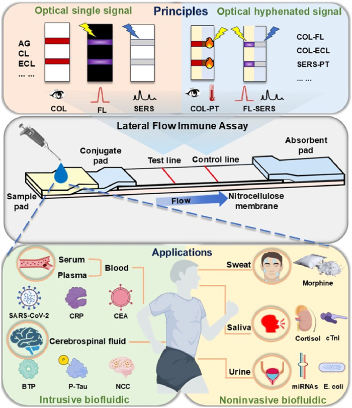 • As an important clinical specimen source, body fluids mainly include blood, urine, saliva, cerebrospinal fluid (CSF). These fluids serve as essential sources of diagnostic diseases, as they contain a wide array of biomolecules. By assessing the molecular content of these fluids, researchers can identify biomarkers associated with a range of diseases, including cancers, infections, and cardiovascular conditions [1]. Detecting biomarkers in biological fluids is critically important for diagnosing diseases such as infections, chronic conditions, cancer, and cardiovascular diseases [2,3]. For example, high phosphorylation of tau at Ser 396,404 (p-tau396,404) and amyloid-β1–42 (Aβ1–42) in blood or CSF can be indicative of neurodegenerative disorders such as Alzheimer's disease (AD) or Parkinson's disease [4,5]. Similarly, the detection of viral antigen and cardiac troponin I (cTnI) in saliva or urine can be used to diagnose infectious diseases such as coronavirus disease (COVID-19) and influenza A virus [6,7]. Therefore, detecting biomarkers in body fluids including proteins, nucleic acids, and other biomolecules indicative of pathological conditions [8-10], are essential for identifying infectious diseases and chronic illnesses and responding to acute public health emergencies [11-13]. These biomarkers can be obtained from invasive sources (such as blood and CSF) [14-18], or non-invasive sources (including urine [19], saliva [20], and sweat [21]). Among the various techniques available for biomarker detection, optical lateral flow immune assay (LFIA) technology can observe the optical signal change from the colloidal gold to realize rapid detection [13]. LFIA is a paper-based detection and quantitative analysis platform that has gradually become an essential tool for clinical body fluid sample testing due to its simple operation, high sensitivity, and rapid detection [22,23]. Unlike more complex laboratory-based methods such as Lab-on-a-Chip [24] or Lab-on-a-Disc [25], LFIA does not necessitate sophisticated equipment or highly trained personnel, making it suitable for home, on-site, and point-of-care testing (POCT).