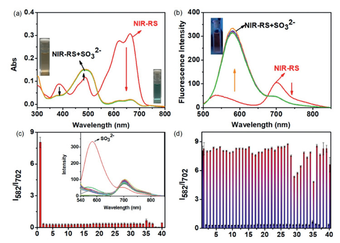 Figure 1  (a) Ultraviolet (UV) spectrum changes of NIR-RS (10 µmol/L) in the presence of SO2 derivative (200 µmol/L). (b) Fluorescence spectrum changes of NIR-RS (10 µmol/L) detection of SO2 derivative (200 µmol/L). (c) Fluorescence ratio (I582/I702) of NIR-RS upon addition of various analytes (200 µmol/L). 1–40: HSO3, blank, Cl, I, HCO3, OCN, AcO, C2O42−, S2O72−, HSO4, F, Br, SCN, NO2, S2O32−, Ser, Glu, Lys, Arg, Gly, Phe, His, Ala, Met, Ile, Gln, Thr, Ca2+, Zn2+, Al3+, Fe3+, Cu2+, Mg2+, 5 mmol/L GSH, 200 µmol/L NaHS, Hcy, Cys, S8, CH3SSSCH3, Na2S2 (insert fluorescence spectrum). (d) Competition experiments of NIR-RS for the above various analytes. All experiments were performed in PBS buffer (10 mmol/L, pH 7.4) with 30% DMF at 37 ℃. λex = 480 nm, slit width (10, 10). Data are presented as mean ± standard deviation (SD) (n = 3).