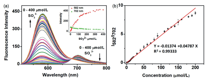 Figure 2  Fluorescent spectral changes of probe NIR-RS (10 µmol/L) upon addition of HSO3 (0–400 µmol/L) Insert: Fluorescence intensity changes at 582 and 702 nm. (b) The linear relationship between the variation in fluorescence ratio (I587/I702) and HSO3 in the range of 0–200 µmol/L. λex = 480 nm, slit width (10, 10). Data are presented as mean ± SD (n = 3).
