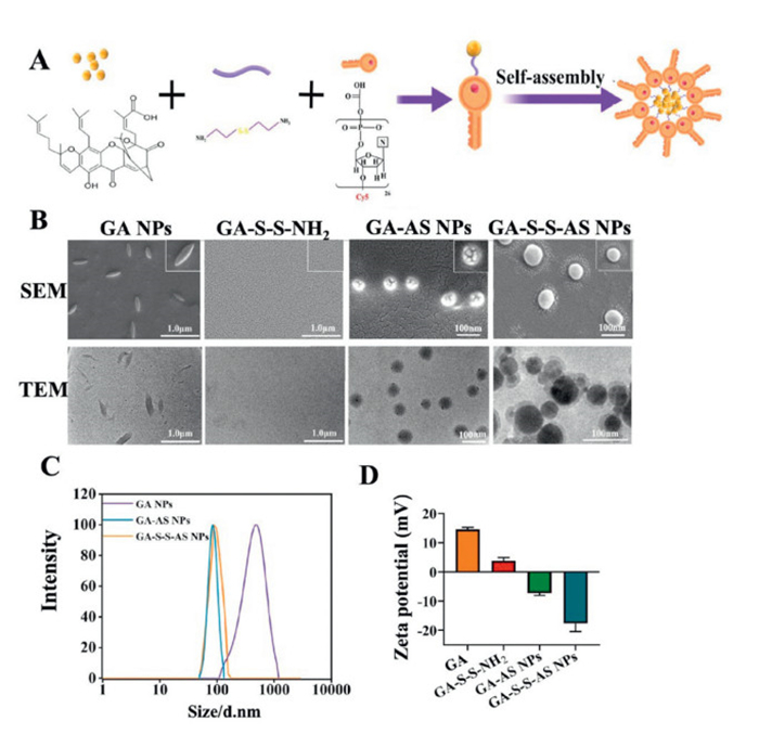 Figure 1  (A) Preparation process of GA-S-S-AS NPs. (B) SEM and TEM images of GA NPs, GA-S-S-NH2, GA-AS NPs, and GA-S-S-AS NPs. (C) Particle sizes of GA NPs, GA-AS NPs and GA-S-S-AS NPs. (D) Zeta potentials of GA NPs, GA-S-S-NH2, GA-AS NPs and GA-S-S-AS NPs. Data are presented as mean ± standard deviation (SD) (n = 3).