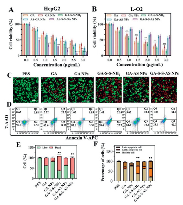 Figure 2.  Cytotoxicity of HepG2 cells (A) and L-O2 cells (B) exposed to different concentrations of treatment groups (GA dose was 0, 0.5, 1, 1.5, 2, 3 µg/mL) for 24 h. (C) Staining analysis images of live/dead cells in different treatment groups (scale bar: 100 µm). (D) Apoptosis of HepG2 cells induced by different treatment groups analyzed by flow cytometer. (E) Quantitative staining results of live/dead cells in different treatment groups. (F) Percentage of apoptotic cells including early and late-stage apoptotic cells in different groups. Values represented were means ± SD (n = 5). P < 0.05, **P < 0.01, ***P < 0.001.