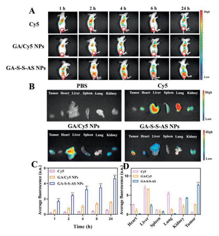 Figure 3  (A) Fluorescence pictures of HepG2 tumor-bearing mice taken at various intervals following intravenous injections of GA/Cy5 NPs, GA-S-S-AS NPs, and Cy5. (B) Fluorescence pictures captured in vitro 24 h after injection of main organs and tumors that were removed. (C) Quantitative evaluation of the average Cy5 fluorescence intensity in tumors at various in vivo time intervals. (D) Twenty-four hours after injection, the average fluorescence intensity of the tumors and organs visible in ex vivo imaging. Values represented were means ± SD (n = 4). ***P < 0.001.