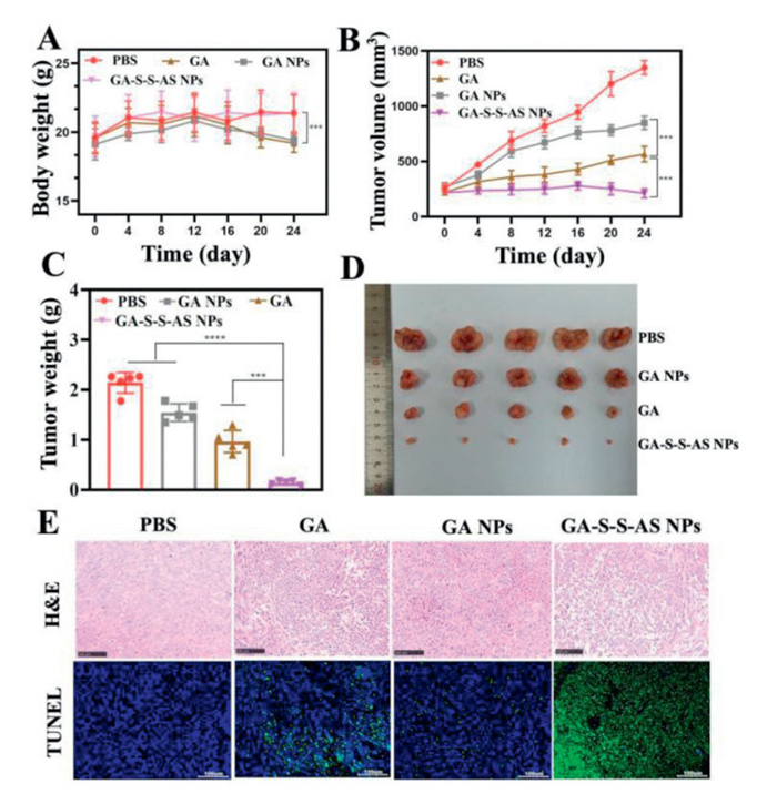 Figure 4.  (A) Changes in body weight of mice in different treatment groups. (B) Tumor growth curves of mice treated with different groups (4 mg/kg GA). The therapeutic terminal's tumor weight (C) and photo of the tumors removed from the mice (D). (E) TUNEL and H&E staining of the tumor tissues that were extracted from various groups. Scale bar: 100 µm. The data is shown as mean ± SD (n = 6). ***P < 0.001, ****P < 0.0001.