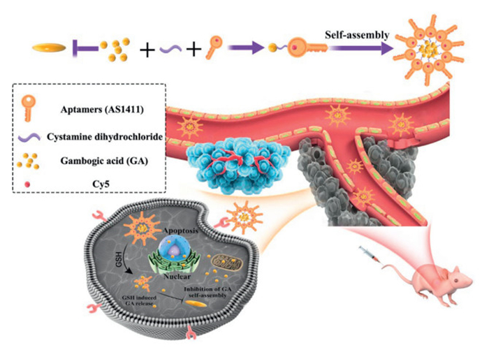 The utilization of traditional Chinese medicine (TCM) has facilitated the advancement and utilization of TCM constituents and bioactive compounds [9]. Gambogic acid (GA), a bioactive compound derived from the traditional Chinese medicine Garcinia, has demonstrated efficacy as a natural broad-spectrum antitumor agent and an inhibitor of heat shock protein 90 (HSP90), a protein closely associated with the regulation of tumor cell proliferation and apoptosis [10,11]. Research has indicated that GA exhibits a lower effective therapeutic concentration compared to other antitumor drugs and is relatively safe, with minimal adverse effects on cardiovascular and respiratory systems [12]. Its antitumor mechanism involves various processes including apoptosis induction, autophagy, anti-proliferation, accumulation of reactive oxygen species (ROS), inhibition of enzymes (such as telomerase) and growth factors (such as vascular endothelial growth factor (VEGF)), modulation of the nuclear transcription factor κ-activated B cell light chain enhancer (NF-κB) signaling pathway [1315], and other related pathways. The National Medical Products Administration (NMPA) has granted approval for GA as an antitumor medication for solid tumors in phase 3 clinical trials [16]; however, its effectiveness remains suboptimal due to limited drug solubility and inadequate off-target toxicity [17]. Therefore, in order to obtain the intended anticancer effects, greater doses and repeated administrations are required; nevertheless, using this strategy runs the risk of aggravating systemic toxicity, chemotherapy resistance, and tumor metastasis.