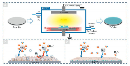 • Figure 1  (a) Schematic diagram of P-C/Zn synthesis process. Illustration of the different electrochemical behaviors between the (b) bare Zn and (c) the optimized P-C/Zn electrodes. Hydrogen evolution reaction (HER).