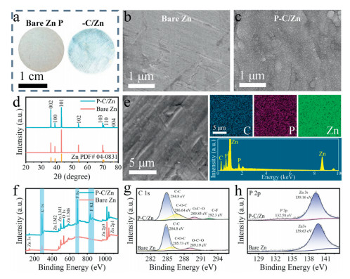 Figure 2.  (a) Optical photograph of the bare Zn and P-C/Zn electrodes. Planar-view SEM images of (b) bare Zn and (c) P-C/Zn electrodes. (d) XRD pattern of bare Zn and P-C/Zn electrode. (e) SEM image of the P-C/Zn electrode and its corresponding element mappings of C, P, Zn and EDS pattern. (f-h) Survey, C 1s, and P 2p XPS spectra of P-C/Zn electrode.