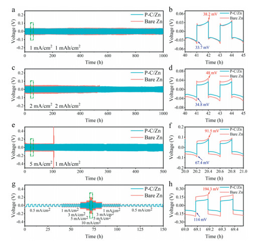 To study the favorable effect of P-C layer on the Zn anode, the long-term sustainability and cyclability of symmetrical cells assembled with bare Zn and P-C/Zn anodes under a constant areal current density and capacity were then investigated and implemented as shown in Fig. 3. From Figs. 3a and b, it was observed that the symmetrical cell of P-C/Zn||P-C/Zn delivered a lower voltage hysteresis than the bare Zn||bare Zn (33.7 vs. 38.2 mV) upon 1000 h at a current density of 1 mA/cm2 and a capacity of 1 mAh/cm2. Moreover, as displayed in Figs. 3cf, the overall overpotential of P-C/Zn||P-C/Zn symmetrical cell are around 34.8 and 67.4 mV, which are still much better than the bare Zn||bare Zn (48 mV, 91.5 mV) under the higher current density and capacity (2 mA/cm2, 2 mAh/cm2; 5 mA/cm2, 1 mAh/cm2). Long-life time of 1000 and 500 h clearly demonstrate that the superb stable cyclability of the optimized P-C/Zn electrode. The bare Zn||bare Zn obviously failed after 500 and 100 h can be ascribed to the short circuit induced by the Zn dendrites formation during cycling. Impressively, as displayed in Figs. 3g and h, the P-C/Zn||P-C/Zn symmetrical cell apparently achieved stable Zn plating/stripping behaviors during the rate capability test particularly at higher current densities. The P-C/Zn-based symmetrical cell could cycle over 150 h and embraced lower voltage polarization than the bare Zn||bare Zn symmetrical cell (27, 35, 55, 71, 116 vs. 33, 45, 82, 115, 196 mV) at various current densities of 0.5, 1.0, 3.0, 5.0, and 10.0 mA/cm2 with a constant areal capacity of 1.0 mAh/cm2. The achieved attractive cycling stability and facilitated kinetics during the Zn ions plating/stripping process highlight the protective capability of the as-constructed P-doped carbon thin-film layer.
