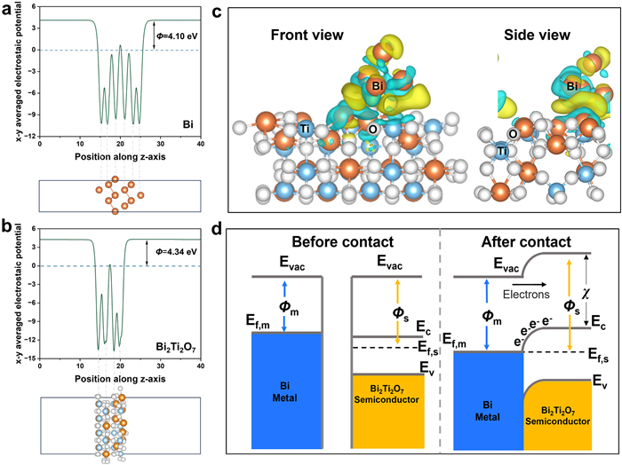 Figure 1.  The work functions of (a) Bi and (b) BT-OV. (c) Calculations of charge density difference of B-BTO. Isosurface level = 0.002 e Å−3; negative charge, blue; positive charge, yellow. (d) Schematic diagram of photogenerated electron transfer before and after contact between Bi and BTO (χ, electron affinity energy; Evac, vacuum level; $ \varPhi_{\mathrm{s}}$, work function of semiconductor; $ \varPhi_{\mathrm{m}}$, work function of metal).