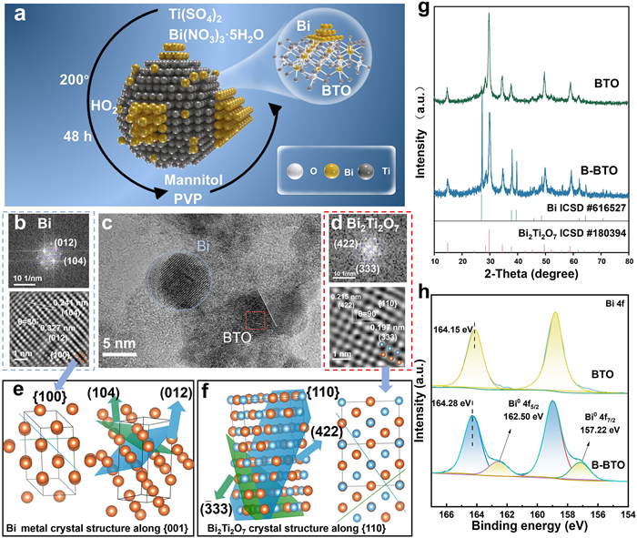 Figure 2  (a) Schematic illustration of the preparation of B-BTO. HRTEM of B-BTO (c), and the corresponding FFT and IFFT for Bi (b) and BTO (d). Crystal structure diagrams of (e) pyrochlore BTO and (f) metal Bi. (g) XRD patterns of BTO and B-BTO. (h) High-resolution scan of the Bi 4f electrons of BTO and B-BTO.