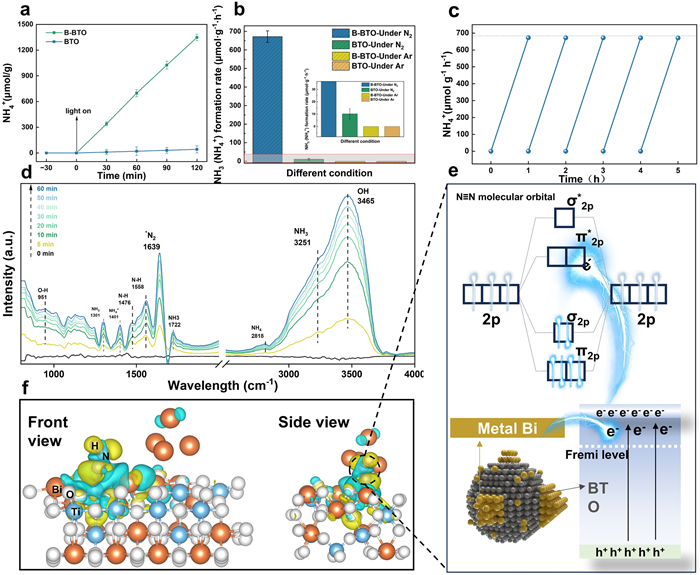 Figure 3  (a) Quantitative determination of the generated NH3 under visible light irradiation catalyzed by B-BTO and BTO. (b) NH4+ synthesis rate of B-BTO and BTO under different conditions. Inset is the zoom in of the shaded area in the figure. (c) Cycling tests of photocatalytic nitrogen fixation. (d) In situ FTIR spectra of B-BTO. (e) Diagram of B-BTO Activated Nitrogen. (f) Calculations of charge density difference of N—NH. Isosurface level = 0.002 e Å−3; negative charge, blue; positive charge, yellow.