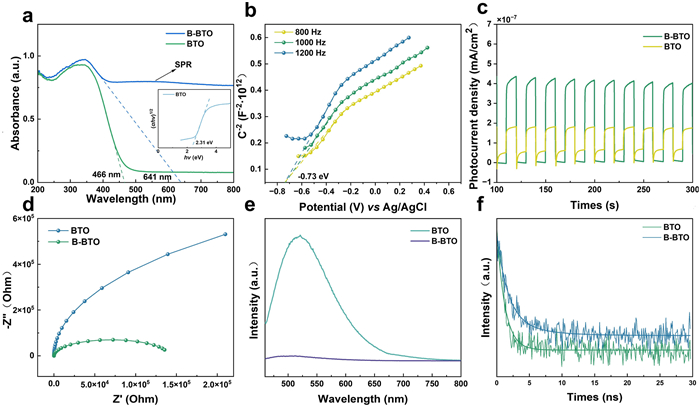 Figure 4.  (a) UV–vis absorption reflectance spectra of BTO and B-BSO. Inset is the Tauc plot of BTO. (b) Mott-Schottky plots of BTO at different frequencies in 0.5 mol/L K2SO4. (c) Photocurrent curves of BTO and B-BTO at various times under solar-light irradiation using a three-electrode setup. (d) Nyquist plots of BTO and B-BTO. (e) Steady-state and (f) time-resolved PL emission spectra of BTO and B-BTO. Excitation wavelength: 445 nm.