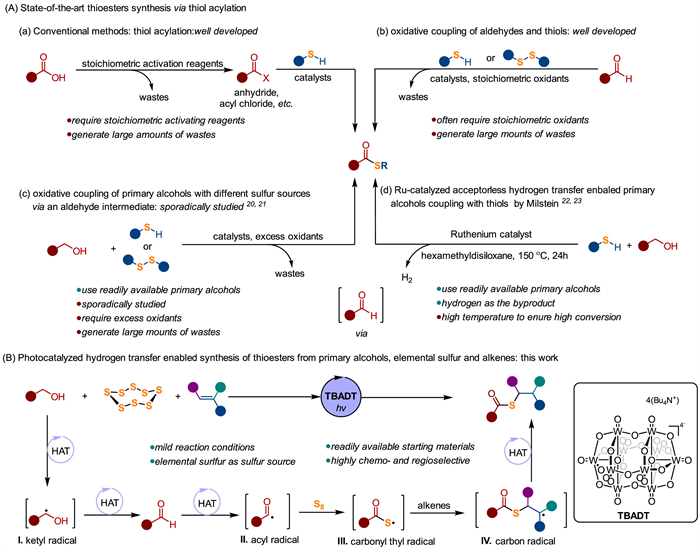We propose a photo-mediated hydrogen transfer strategy for the synthesis of thioesters from primary alcohols, elemental sulfur and alkenes (Fig. 1B). This method offers a greener and more sustainable approach by using readily available and non-toxic sulfur source, which is abundance, non-toxicity, high-stability, and odourless, especially given the global growing surplus of elemental sulfur [24-33]. Recent studies have shown that elemental sulfur can be activated and participate in radical reactions under photocatalytic conditions for the synthesis of sulfur-containing molecules [28-33]. Notably, thioesters can be obtained from the coupling of alkenes with carbonyl thiyl radicals, which are generated by reacting elemental sulfur with acyl radicals derived from α-ketoacids or aldehydes [32,33]. We envisioned that primary alcohols could generate acyl radical via consecutive photo-mediated hydrogen atom transfer (HAT), proceeding through an aldehyde intermediate. Photo-HAT has proven effective for selectively activating α-hydroxy C—H bonds in alcohols, forming ketyl radical () that can undergo various radical transformations [34-36]. Primary alcohols can thereof undergo hydrogen transfer to form aldehydes [37-39], which are more accessible for photo-HAT, producing acyl radical () [40-43]. Subsequently, acyl radical () can react with elemental sulfur, generating carbonyl thiyl radical (), which then add to alkenes, yielding thioesters. Herein, we describe the photocatalyzed hydrogen transfer enabled synthesis of thioesters from primary alcohols, elemental sulfur and alkenes. This method, employing robust tetrabutylammonium decatungstate (TBADT) as the photocatalyst, operates under mild conditions, accommodates a wide range of primary alcohols and alkenes, and demonstrates high functional group tolerance. However, the method still has room for improvement, particularly regarding the use of the high molecular weight photocatalyst and the excess amounts of alcohol and elemental sulfur.