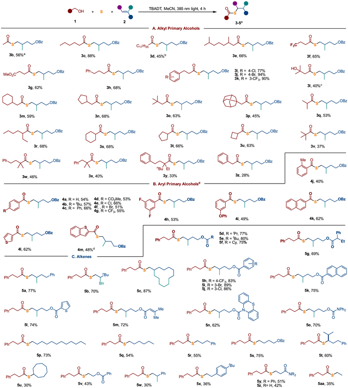 Figure 2  Substrate scope of alcohols. Conditions: 1 (3.5 equiv.), S (3.6 equiv.), 2 (0.25 mmol, 1.0 equiv.), TBADT (5 mol%), CH3CN (0.5 mL), LEDs (2 W, 385 nm) irradiation for 4 h at 35–40 ℃, isolated yields. a 1 (5.0 equiv.). b CH3CN (1.0 mL). c 1 (1.5 equiv.). d 8 h reaction.