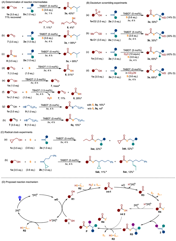 A series of mechanistic experiments were conducted to elucidate the reaction mechanism (Figs. 4AC). The reaction involving 3-phenylpropanol (1a), elemental sulfur and alkene 2a was deliberately stopped at an early stage to identify potential intermediates (Fig. 4A, a). Analysis of the reaction mixture revealed that 15% of 1a was converted to 3-phenylpropanal (7, 11%) and thiocarboxylic acid (8, 4%), with t thioester 3a forming at 40% yield. When aldehyde 7 was subjected to the same reaction conditions with sulfur and 2a, it underwent complete conversion to thioester 3a (Fig. 4A, b), as did thiocarboxylic acid 8 (Fig. 4A, c). These results indicate that aldehyde and thiocarboxylic acid are key intermediates in the reaction.