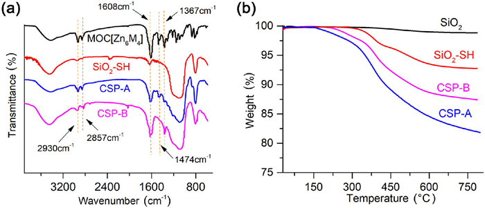 Figure 3  (a) FT-IR spectra of chiral MOC [Zn6M4], SiO2-SH, CSP-A, and CSP-B. (b) TGA curves of silica (SiO2), SiO2-SH, CSP-A, and CSP-B.