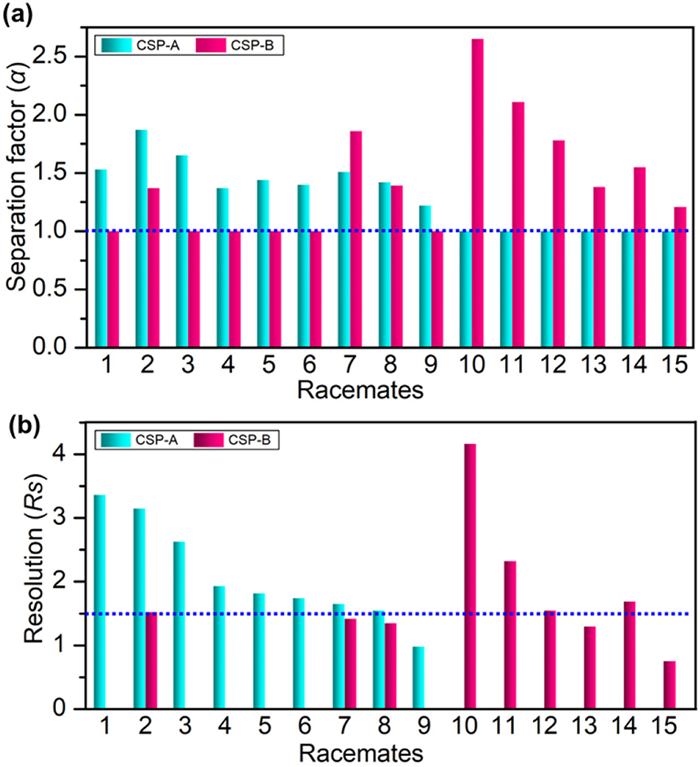 Figure 4.  Statistical data for the separation of racemates on CSP-A and CSP-B in NP-HPLC. (a) The α values of racemates separated on CSP-A and CSP-B. (b) The Rs values of racemates separated on CSP-A and CSP-B. 1: 1-(4-fluorophenyl)ethanol; 2: ethyl mandelate; 3: 2‑methoxy-2-phenylethanol; 4: 1-phenyl-1-pentanol; 5: 1-(3-bromophenyl)ethanol; 6: 1-(4-bromophenyl)ethanol; 7: styrene oxide; 8: 1-(4-chlorophenyl)ethanol; 9: 1-phenylethanol; 10: benzoin; 11: 4,4′-dimethylbenzoin; 12: 1-(3-fluorophenyl)ethanol; 13: methyl mandelate; 14: 4-chlorobenzhydrol; 15: 4-methylbenzhydrol.