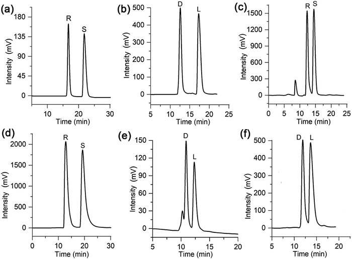 Figure 5  Representative chromatograms obtained on column A (packed with CSP-A) under NP-HPLC: (a) 1-(4-fluorophenyl)ethanol, (b) ethyl mandelate, (c) 1-(4-chlorophenyl)ethanol. Representative chromatograms obtained on column B (packed with CSP-B) under NP-HPLC: (d) 4,4′-dimethylbenzoin, (e) ethyl mandelate, (f) methyl mandelate.