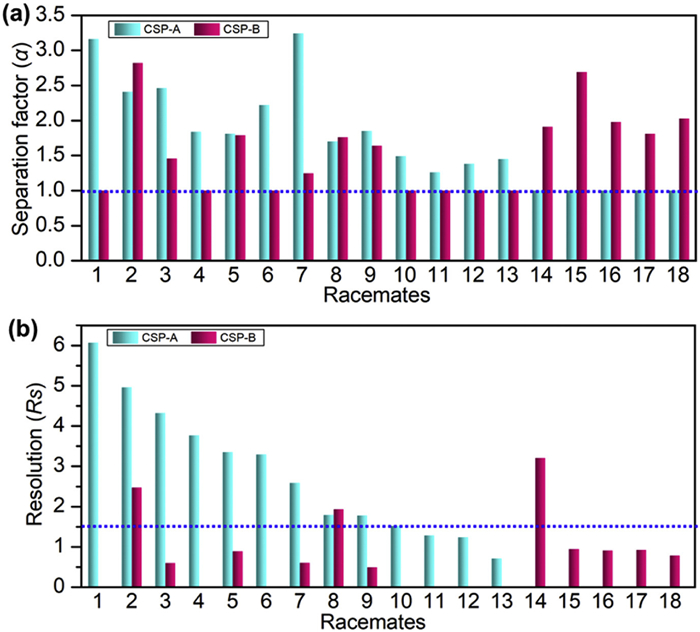 Figure 6.  Statistical data for the separation of racemates on CSP-A and CSP-B in RP-HPLC. (a) The α values of racemates separated on CSP-A and CSP-B. (b) The Rs values of racemates separated on CSP-A and CSP-B. 1: piperoin; 2: anisoin; 3: 4,4′-dimethylbenzoin; 4: 1-(4-methylphenyl)ethanol; 5: 1-phenyl-1-pentanol; 6: benzoin; 7: zopiclone; 8: 1-phenylethanol; 9: 2‑methoxy-2-phenylethanol; 10: 1-(4-fluorophenyl)ethanol; 11: benzoin ethyl ether; 12: methyl mandelate; 13: 1-phenyl-1-butanol; 14: 2-phenylcyclohexanone; 15: 4-methylbenzhydrol; 16: 4-fluoro-α-methylbenzylamine; 17: ethyl mandelate; 18: 3-benzyloxy-1,2-propanediol.