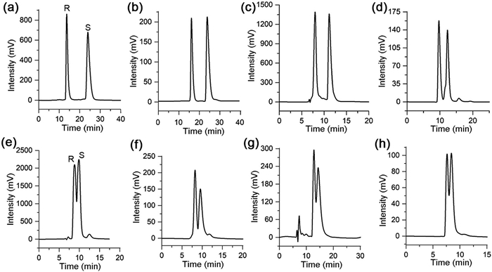 Figure 7  Representative chromatograms obtained on column A (packed with CSP-A) under RP-HPLC: (a) 4,4′-dimethylbenzoin, (b) 1-phenyl-1-pentanol, (c) zopiclone, (d) 2‑methoxy-2-phenylethanol. Representative chromatograms obtained on column B (packed with CSP-B) under RP-HPLC: (e) 4,4′-dimethylbenzoin, (f) 1-phenyl-1-pentanol, (g) zopiclone, (h) 2‑methoxy-2-phenylethanol.